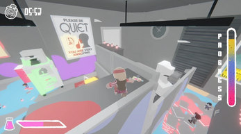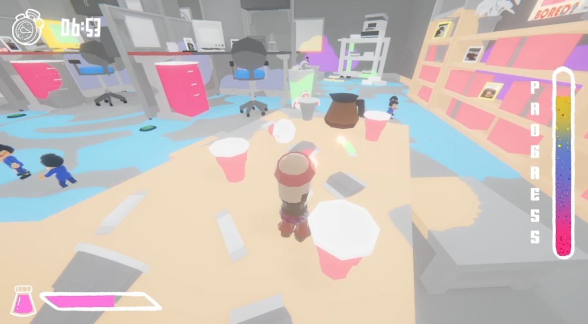 Trapped inside the dream of a sleep-deprived office worker, a hippy awakens in a lifeless, grey cubicle world. Armed with an ink gun, your mission is to splash vibrant colors across dull walls and blast enemy businessmen to restore the office to its TRUE COLORS. Paint fast, stay alive, and fight back against the monotony of corporate gray!